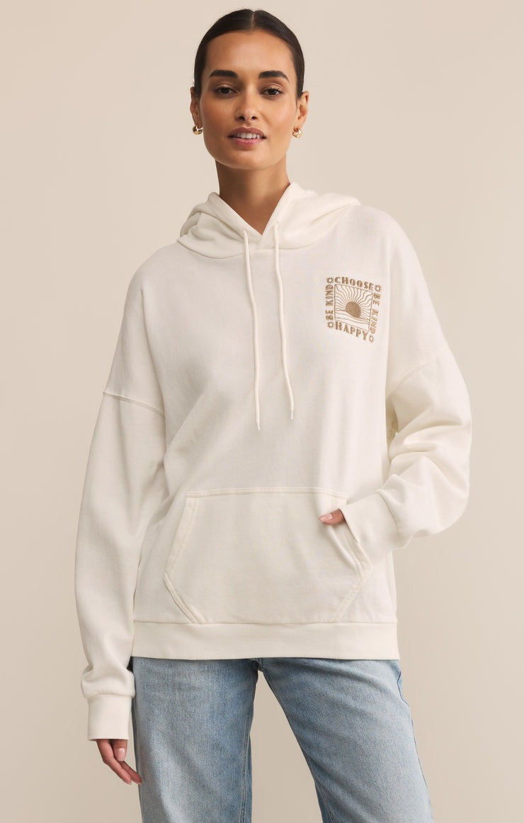 This cozy hoodie was made to brighten your day. Designed in soft brushed fleece with a vintage wash, it features tonal “CHOOSE HAPPY” embroidery on the chest and back, plus a relaxed oversized fit with a classic kangaroo pocket.