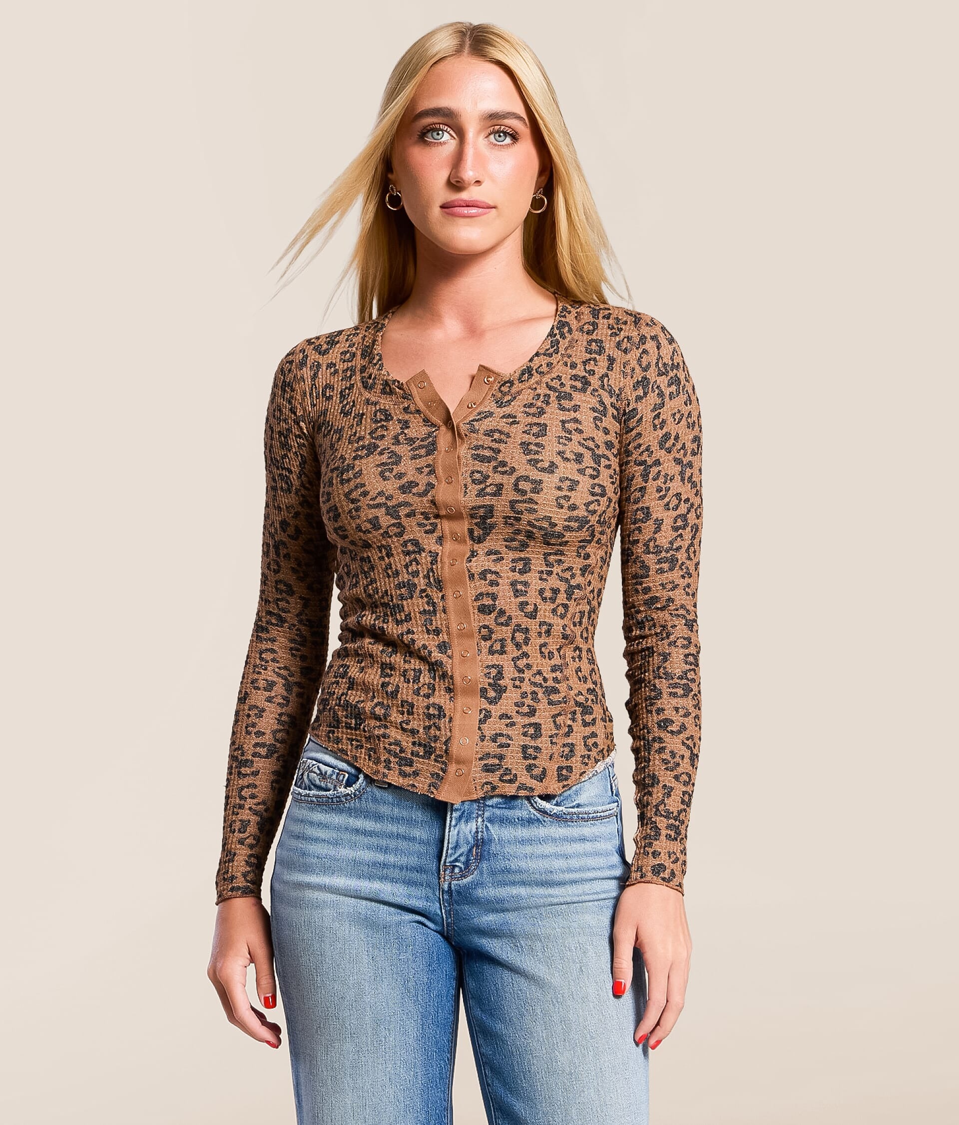 Features: Button-front closure, waffle knit fabrication, crew neckline, long fitted sleeves