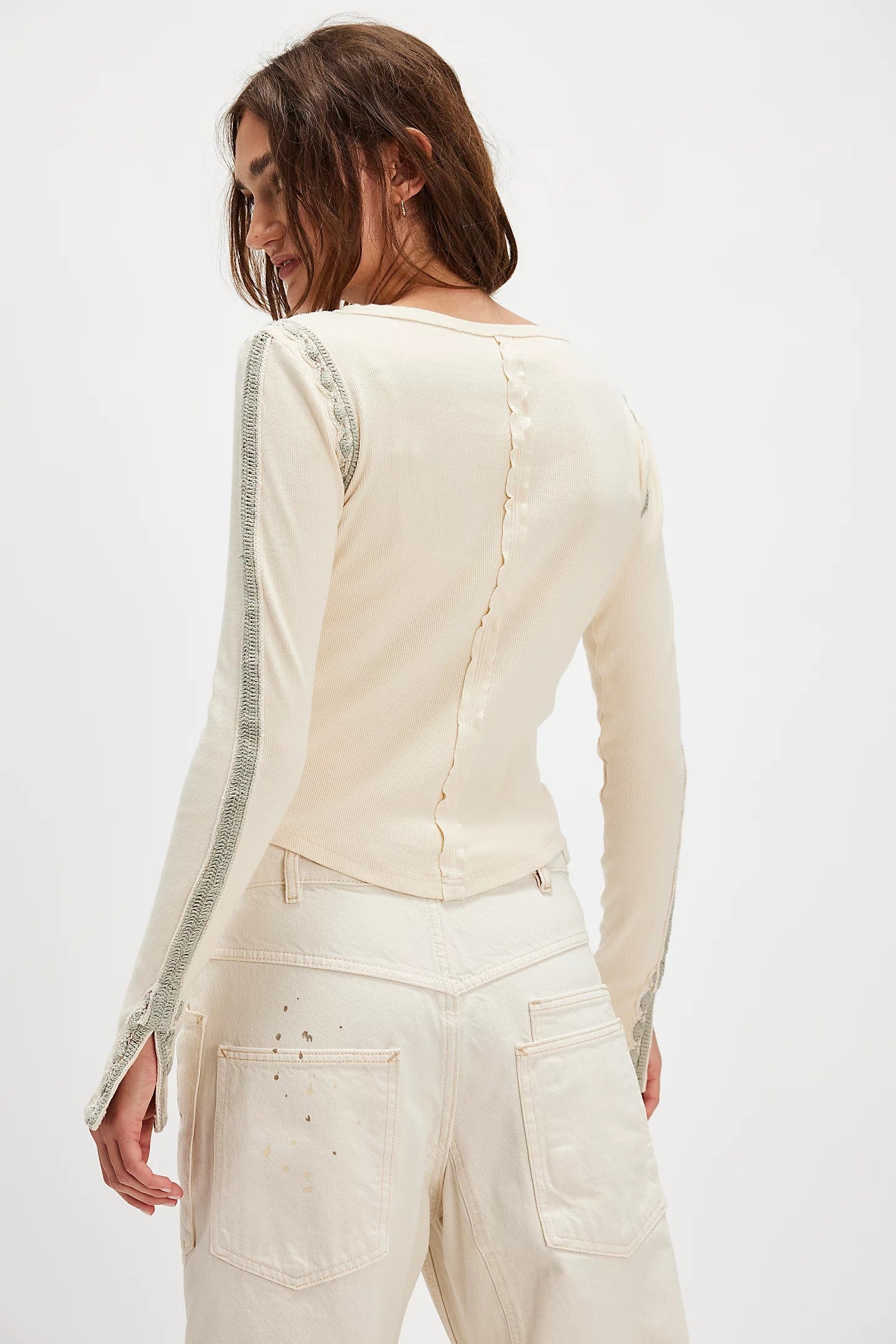otally timeless, this top features a ribbed fabrication and relaxed fit with feminine lace trim and fitted long-sleeves.