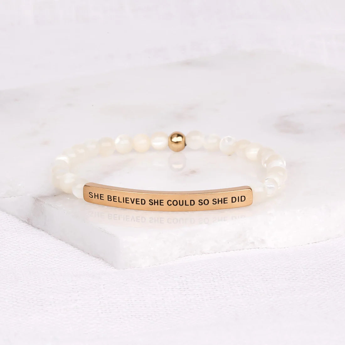 - Our bracelets are beautiful reminders that are crafted with earth stone beads and featuring a message of inspiration engraved on a stainless-steel bar. Wear them throughout the day to fill your mind with inspiration.